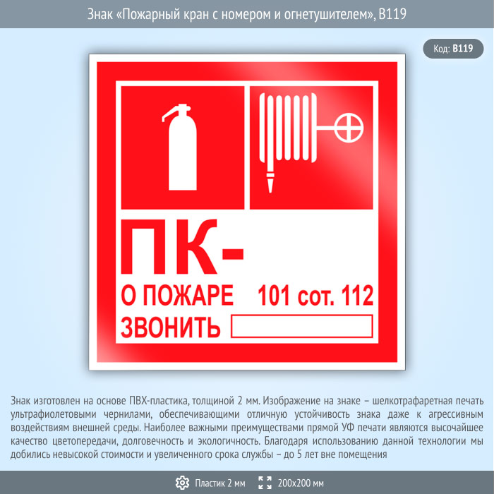 Знак «Пожарный кран с номером и огнетушителем», B119 (пластик, 200х200 мм) в Краснодаре купить