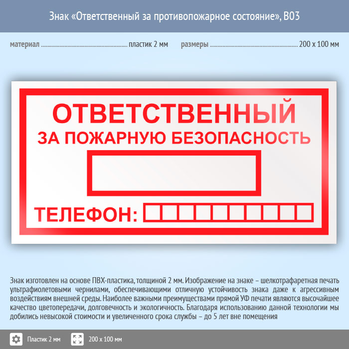 Знак «Ответственный за пожарную безопасность», B03 (пластик, 200х100 мм) в Краснодаре купить