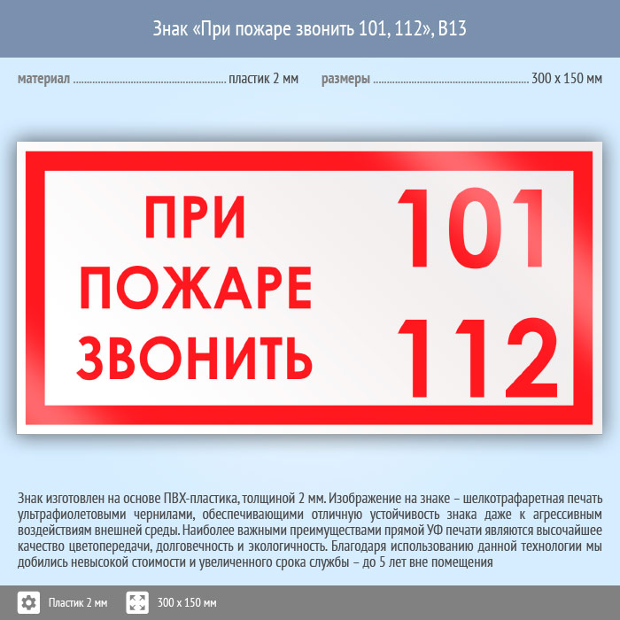 Знак «При пожаре звонить 101, 112», B13 (пластик, 300х150 мм) в Краснодаре купить