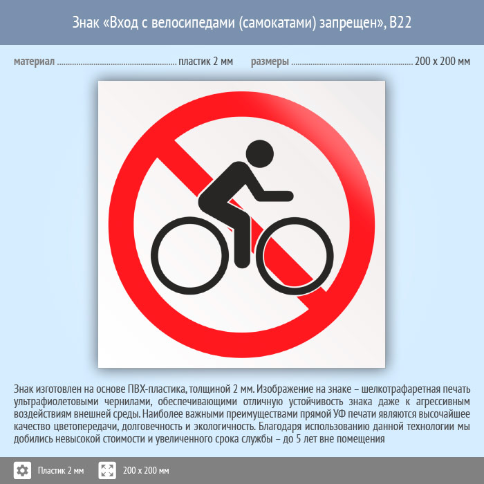 Знак «Вход с велосипедами (самокатами) запрещен», B22 (пластик, 200х200 мм) в Краснодаре купить