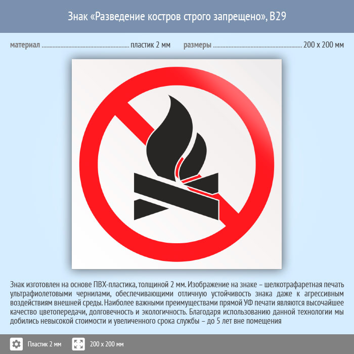 Знак «Разведение костров строго запрещено», B29 (пластик, 200х200 мм) в Краснодаре купить