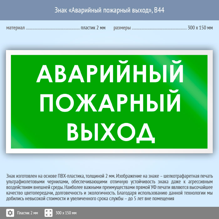 Знак «Аварийный пожарный выход», B44 (пластик, 300х150 мм) в Краснодаре купить