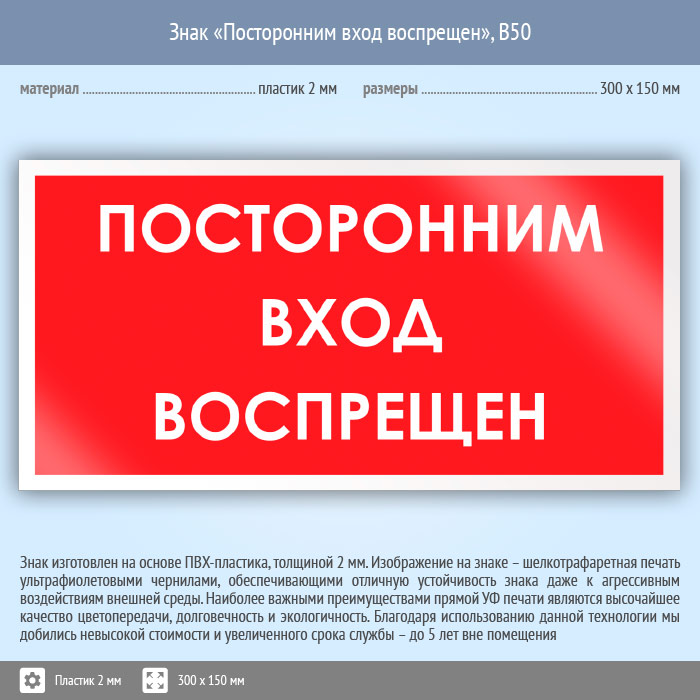 Знак «Посторонним вход воспрещен», B50 (пластик, 300х150 мм) в Краснодаре купить