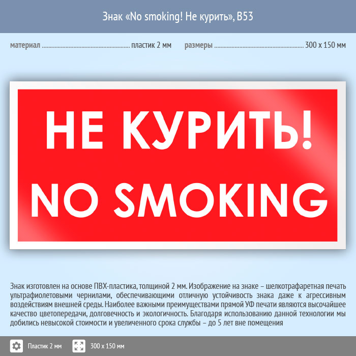 Знак «No smoking! Не курить», B53 (пластик, 300х150 мм) в Краснодаре купить