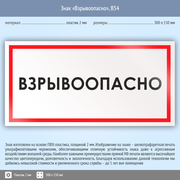 Знак «Взрывоопасно», B54 (пластик, 300х150 мм) в Краснодаре купить