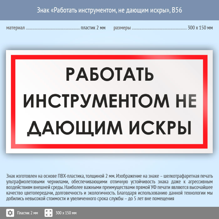 Знак «Работать инструментом, не дающим искры», B56 (пластик, 300х150 мм) в Краснодаре купить
