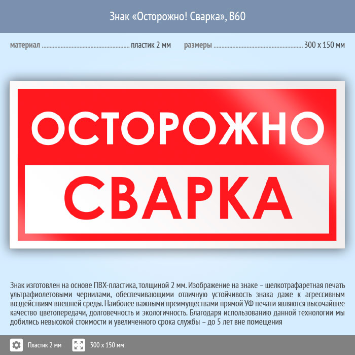 Знак «Осторожно! Сварка», B60 (пластик, 300х150 мм) в Краснодаре купить
