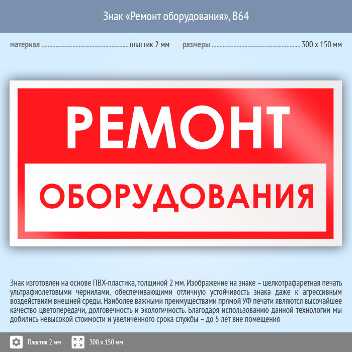 Знак «Ремонт оборудования», B64 (пластик, 300х150 мм) в Краснодаре купить