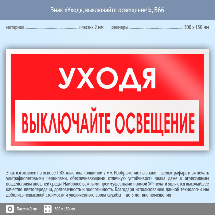 Знак «Уходя, выключайте освещение!», B66 (пластик, 300х150 мм) в Краснодаре купить
