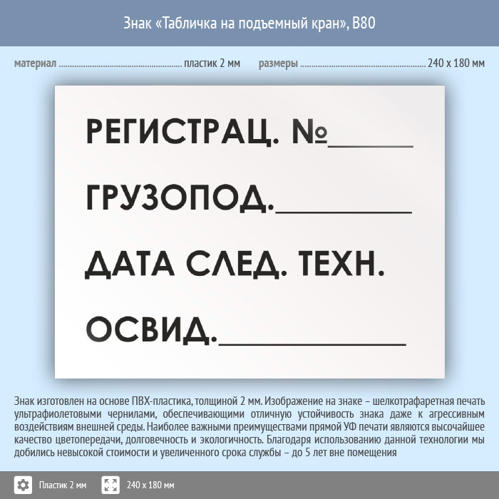 Знак «Табличка на подъемный кран», B80 (пластик, 240х180 мм) в Краснодаре купить