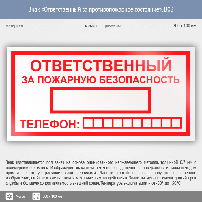 Знак «Ответственный за пожарную безопасность», B03 (металл, 200х100 мм) в Краснодаре купить
