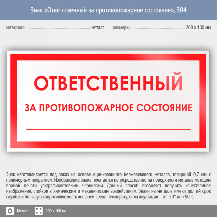 Знак «Ответственный за противопожарное состояние», B04 (металл, 200х100 мм) в Краснодаре купить