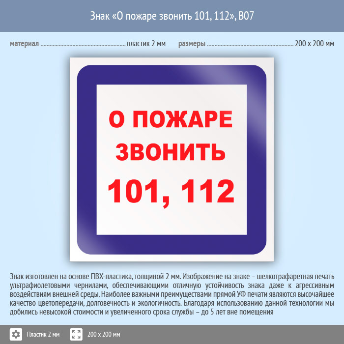 Знак «О пожаре звонить 101, 112», B07 (пластик, 200х200 мм) в Краснодаре купить