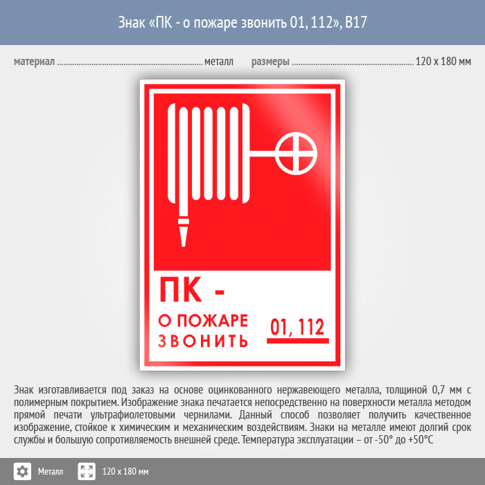 Знак «ПК - о пожаре звонить 01, 112», B17 (металл, 120х180 мм) в Краснодаре купить