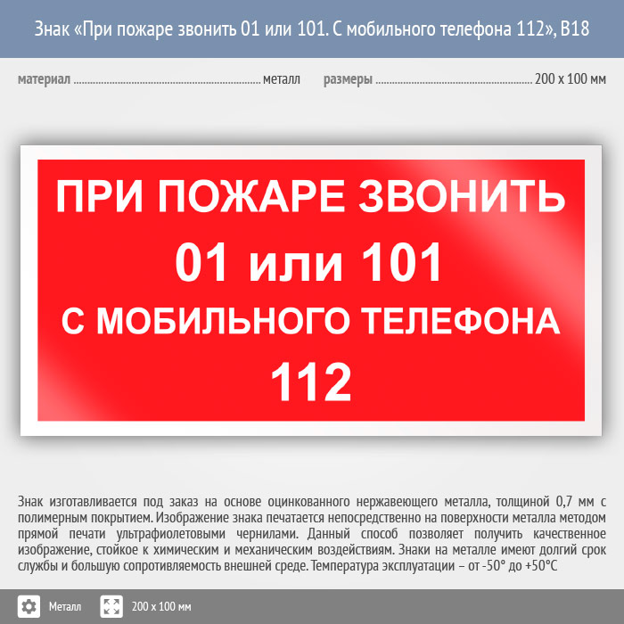 Знак «При пожаре звонить 01 или 101. С мобильного телефона 112», B18 (металл, 200х100 мм) в Краснодаре купить