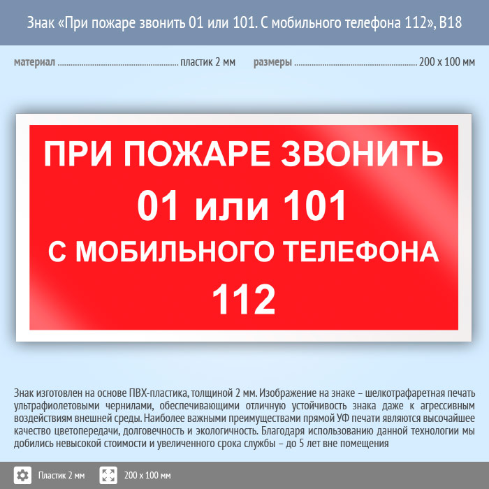Знак «При пожаре звонить 01 или 101. С мобильного телефона 112», B18 (пластик, 200х100 мм) в Краснодаре купить