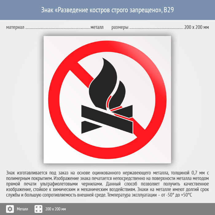 Знак «Разведение костров строго запрещено», B29 (металл, 200х200 мм) в Краснодаре купить