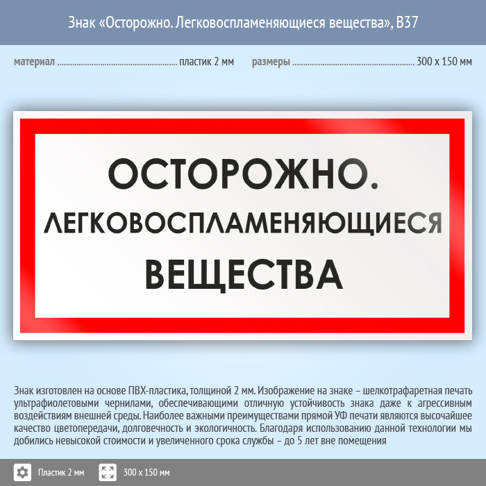 Знак «Осторожно. Легковоспламеняющиеся вещества», B37 (пластик, 300х150 мм) в Краснодаре купить