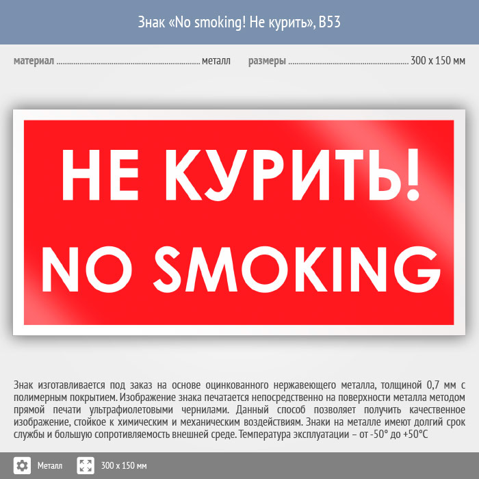 Знак «No smoking! Не курить», B53 (металл, 300х150 мм) в Краснодаре купить