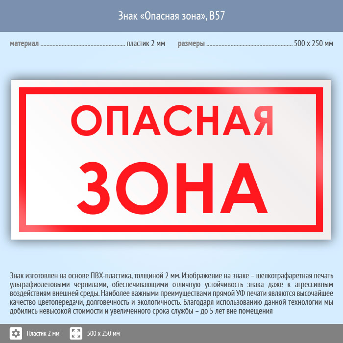 Знак «Опасная зона», B57 (пластик, 500х250 мм) в Краснодаре купить