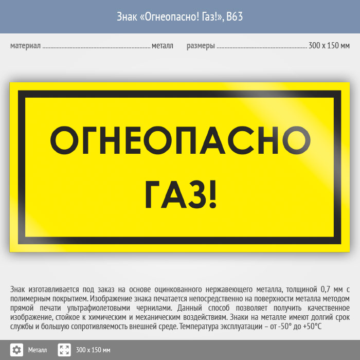Знак «Огнеопасно! Газ!», B63 (металл, 300х150 мм) в Краснодаре купить