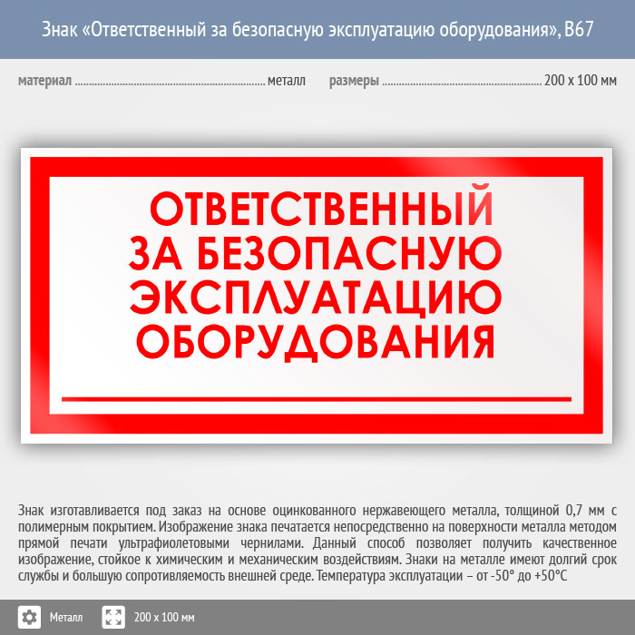 Знак «Ответственный за безопасную эксплуатацию оборудования», B67 (металл, 200х100 мм) в Краснодаре купить