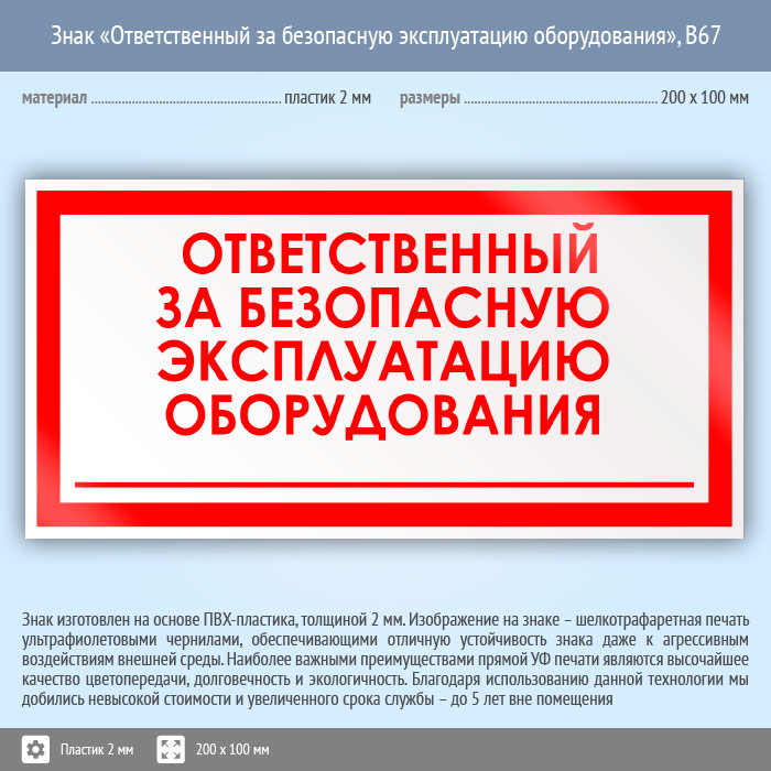 Знак «Ответственный за безопасную эксплуатацию оборудования», B67 (пластик, 200х100 мм) в Краснодаре купить