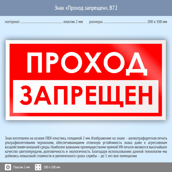 Знак «Проход запрещен», B72 (пластик, 200х100 мм) в Краснодаре купить