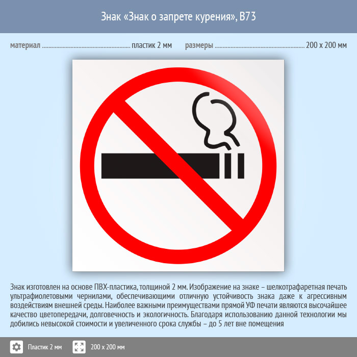 Знак «Знак о запрете курения», B73 (пластик, 200х200 мм) в Краснодаре купить