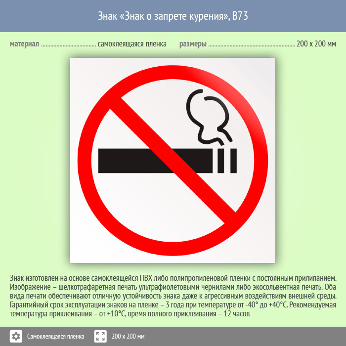 Знак «Знак о запрете курения», B73 (пленка, 200х200 мм) в Краснодаре купить