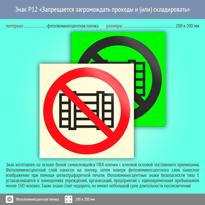 Знак P12 «Запрещается загромождать проходы и (или) складировать» (фотолюминесцентная пленка, 200х200 мм) в Краснодаре купить