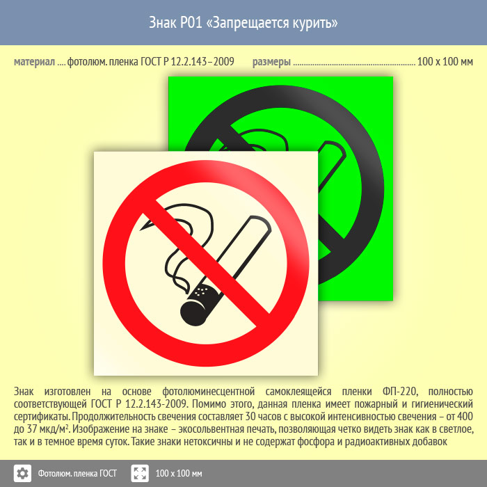 Знак P01 «Запрещается курить» (фотолюминесцентная пленка ГОСТ 34428-2018, 100х100 мм) в Краснодаре купить