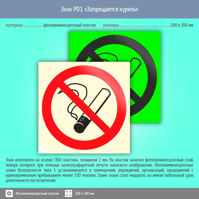Знак P01 «Запрещается курить» (фотолюминесцентный пластик, 200х200 мм) в Краснодаре купить