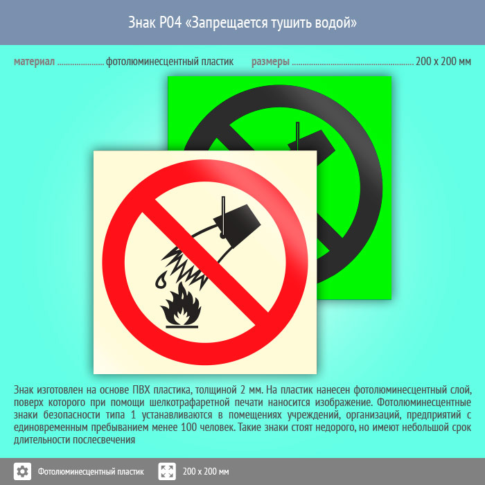Знак P04 «Запрещается тушить водой» (фотолюминесцентный пластик, 200х200 мм) в Краснодаре купить