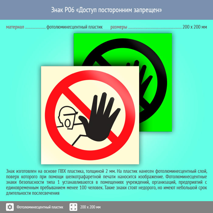 Знак P06 «Доступ посторонним запрещен» (фотолюминесцентный пластик, 200х200 мм) в Краснодаре купить