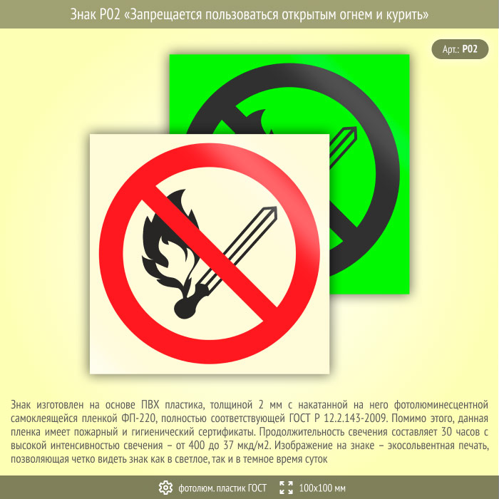 Знак P02 «Запрещается пользоваться открытым огнем и курить» (фотолюминесцентный пластик ГОСТ 34428-2018, 100х100 мм) в Краснодаре купить