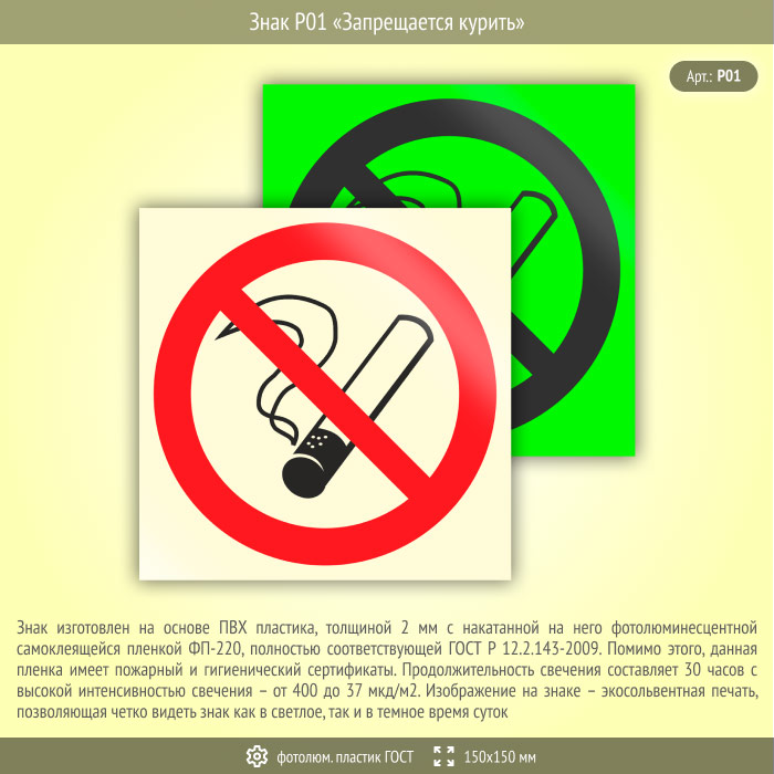 Знак P01 «Запрещается курить» (фотолюминесцентный пластик ГОСТ 34428-2018, 150х150 мм) в Краснодаре купить