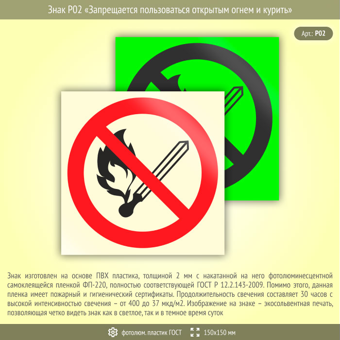 Знак P02 «Запрещается пользоваться открытым огнем и курить» (фотолюминесцентный пластик ГОСТ 34428-2018, 150х150 мм) в Краснодаре купить