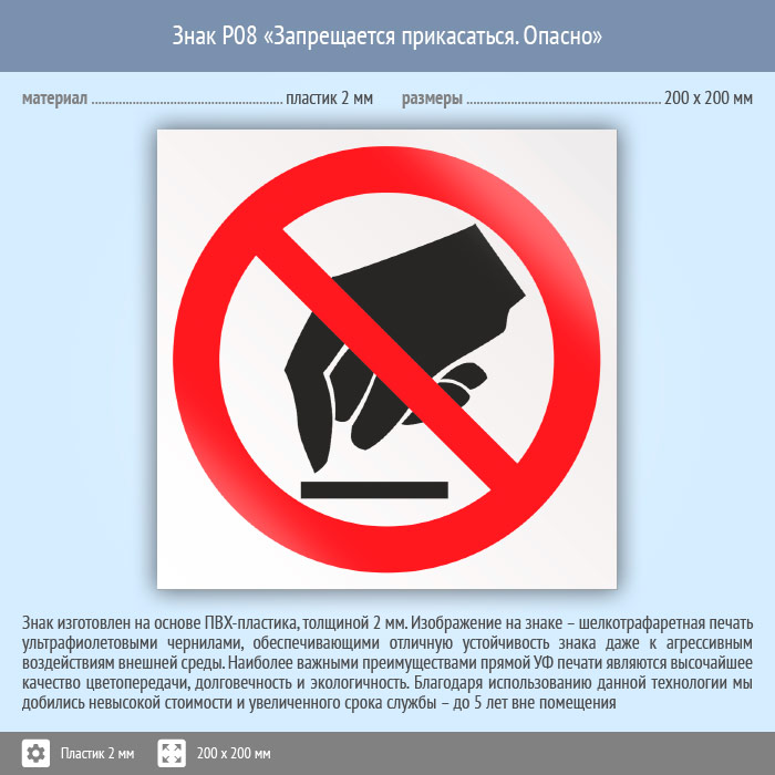 Знак P08 «Запрещается прикасаться. Опасно» (пластик, 200х200 мм) в Краснодаре купить