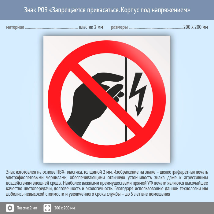 Знак P09 «Запрещается прикасаться. Корпус под напряжением» (пластик, 200х200 мм) в Краснодаре купить