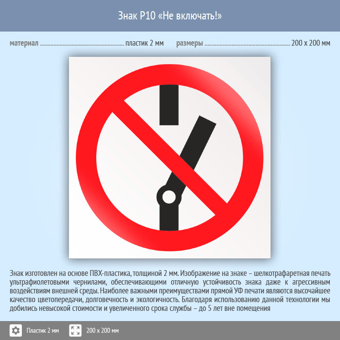 Знак P10 «Не включать!» (пластик, 200х200 мм) в Краснодаре купить