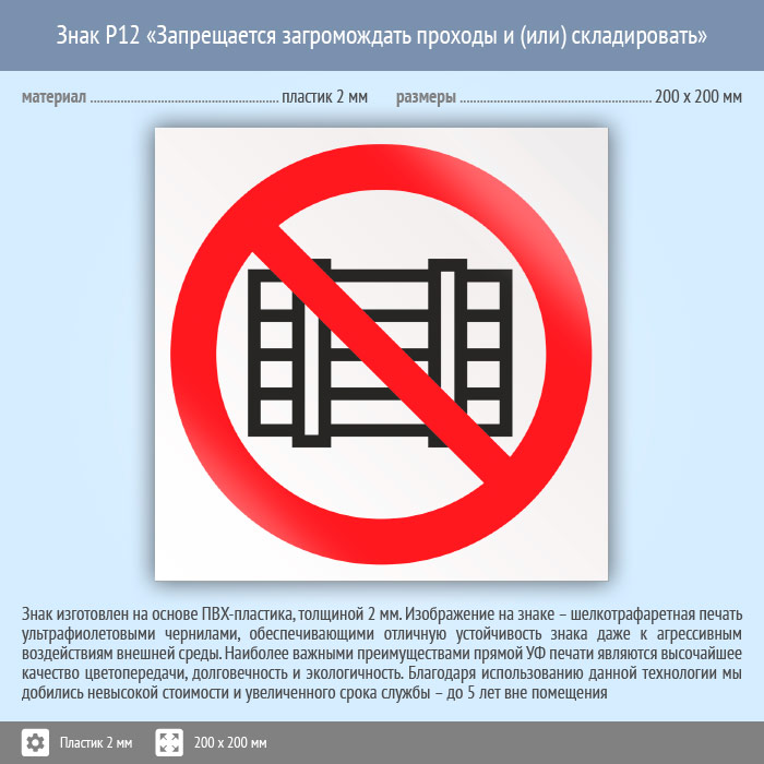 Знак P12 «Запрещается загромождать проходы и (или) складировать» (пластик, 200х200 мм) в Краснодаре купить