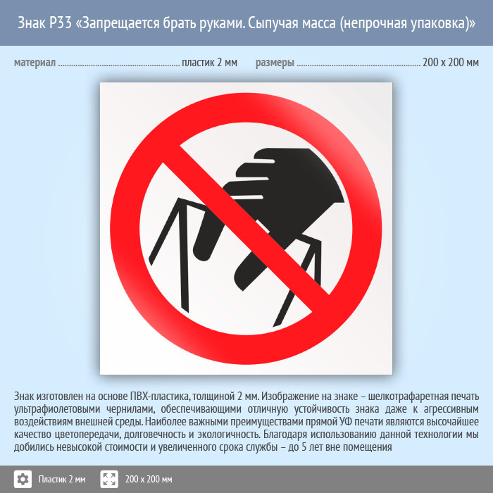 Знак P33 «Запрещается брать руками. Сыпучая масса (непрочная упаковка)» (пластик, 200х200 мм) в Краснодаре купить