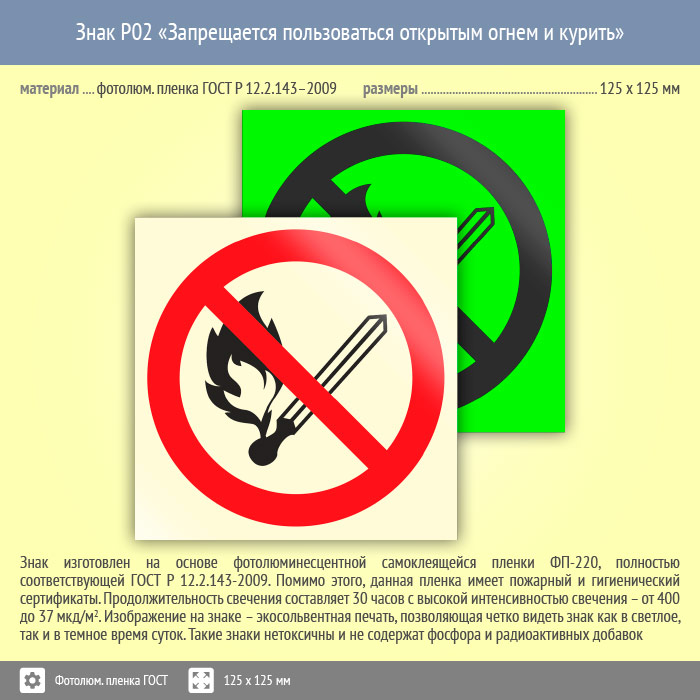 Знак P02 «Запрещается пользоваться открытым огнем и курить» (фотолюминесцентная пленка ГОСТ 34428-2018, 125х125 мм) в Краснодаре купить