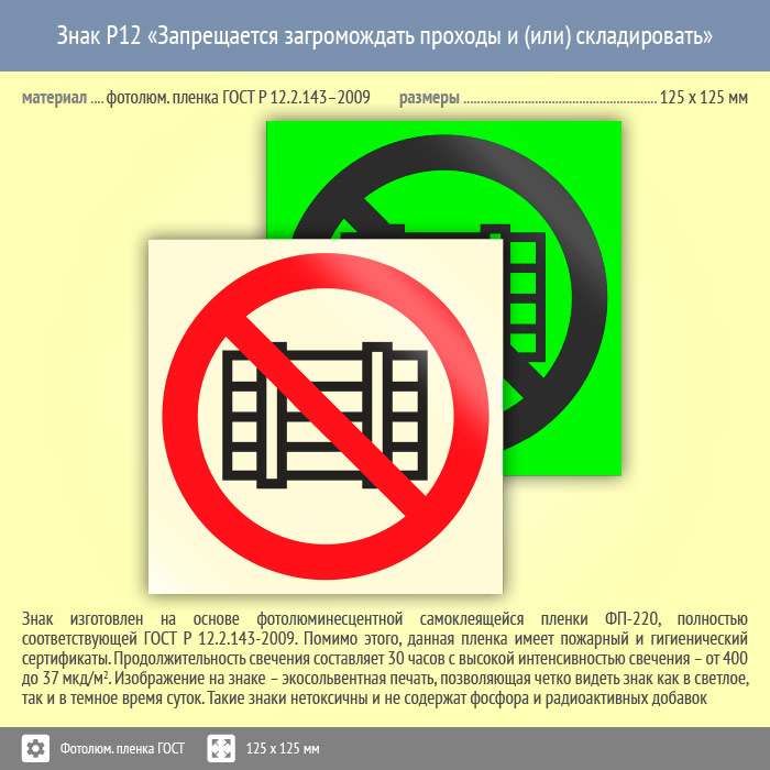 Знак P12 «Запрещается загромождать проходы и (или) складировать» (фотолюминесцентная пленка ГОСТ 34428-2018, 125х125 мм) в Краснодаре купить