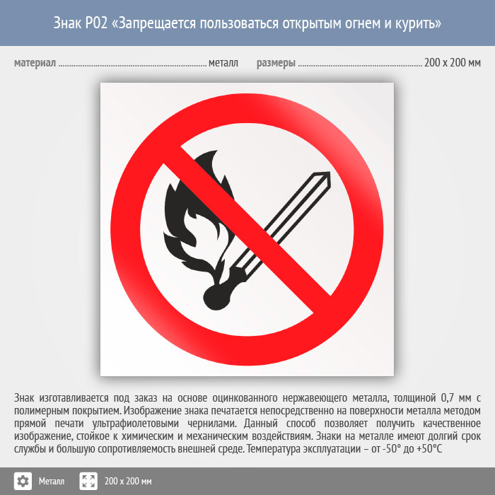 Знак P02 «Запрещается пользоваться открытым огнем и курить» (металл, 200х200 мм) в Краснодаре купить