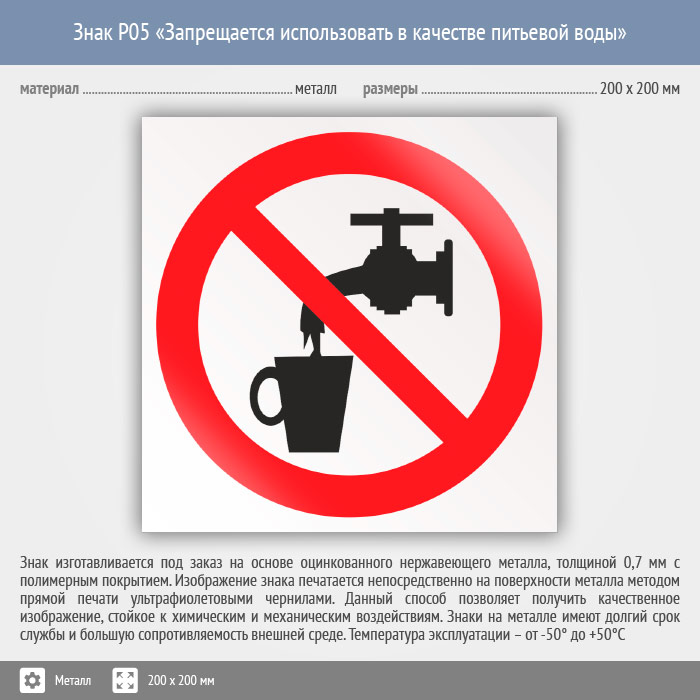 Знак P05 «Запрещается использовать в качестве питьевой воды» (металл, 200х200 мм) в Краснодаре купить