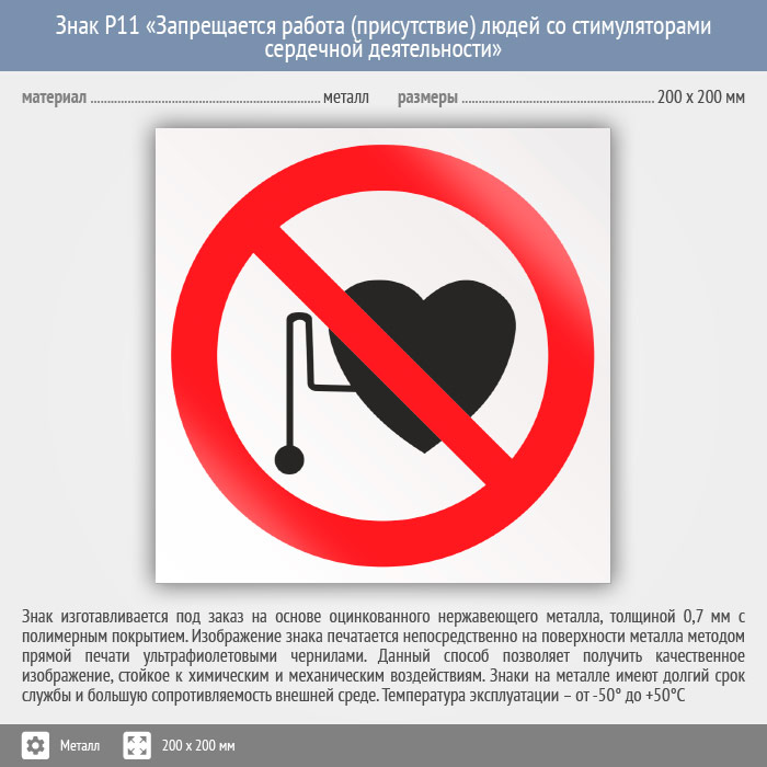 Знак P11 «Запрещается работа (присутствие) людей со стимуляторами сердечной деятельности» (металл, 200х200 мм) в Краснодаре купить