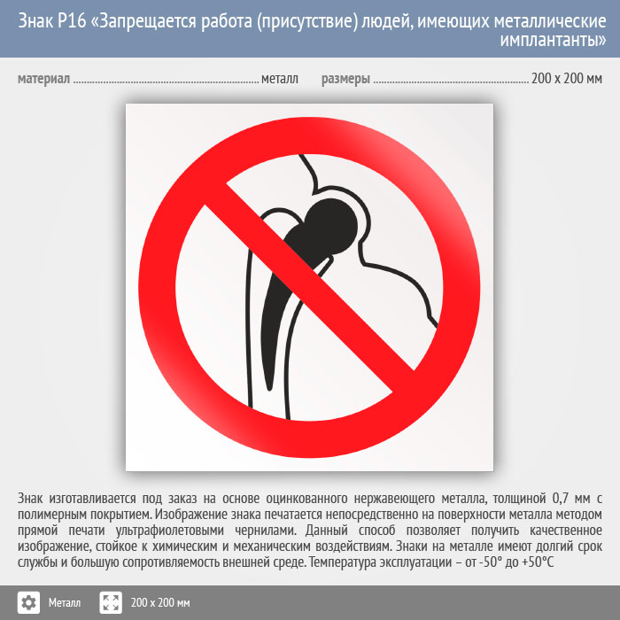 Знак P16 «Запрещается работа (присутствие) людей, имеющих металлические имплантанты» (металл, 200х200 мм) в Краснодаре купить