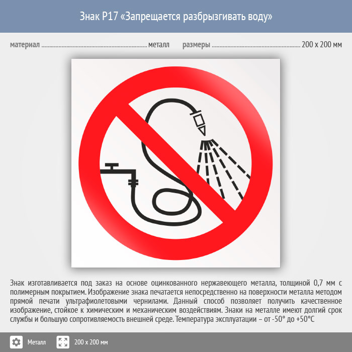 Знак P17 «Запрещается разбрызгивать воду» (металл, 200х200 мм) в Краснодаре купить